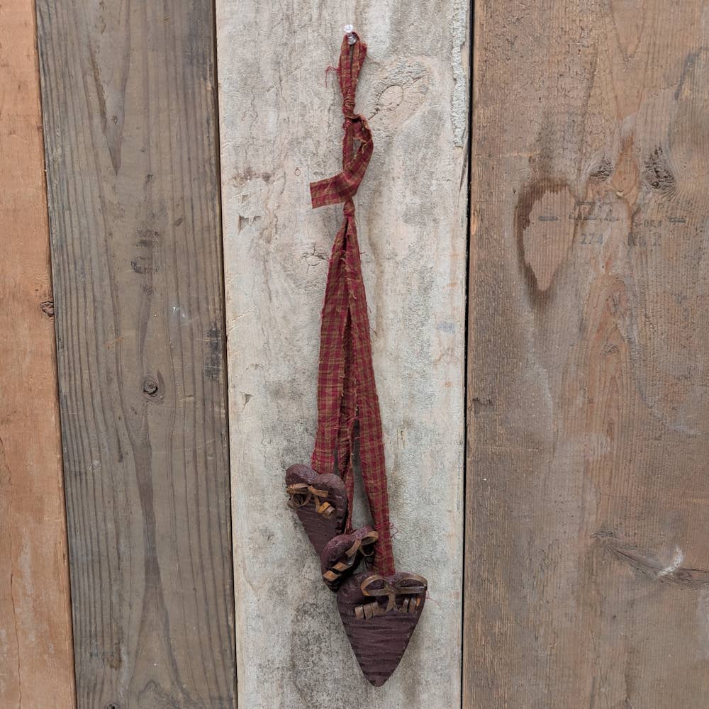 This primitive set of three hanging hearts is a great deal! Homespun fabric with a loop hanger and 3 different size wood hearts is an adorable accent to just about anything! Each heart has a tin bow. The entire thing measures 19" long.